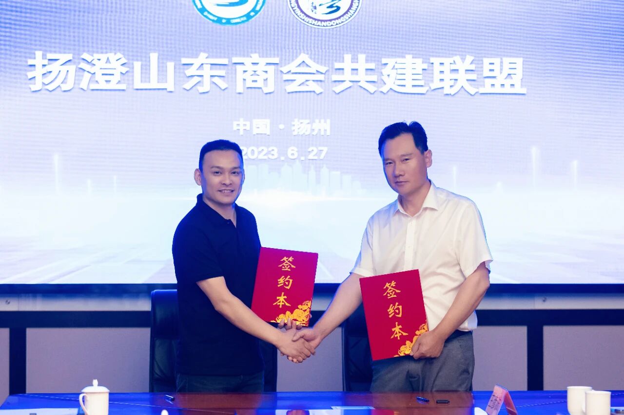 江阴市山东商会会长刘广振、扬州市山东商会会长莫西欢代表商会签署共建协议。江阴市山东商会党支部书记兼监事长崔志强、常务副会长周长伟、副会长林浩、孙中华、王彦波、秘书长付良洲,扬州市山东商会名誉会长孙振兴、秘书长周德余、监事长李冠军、书记李东华、执行秘书长仝义良等出席签约仪式。